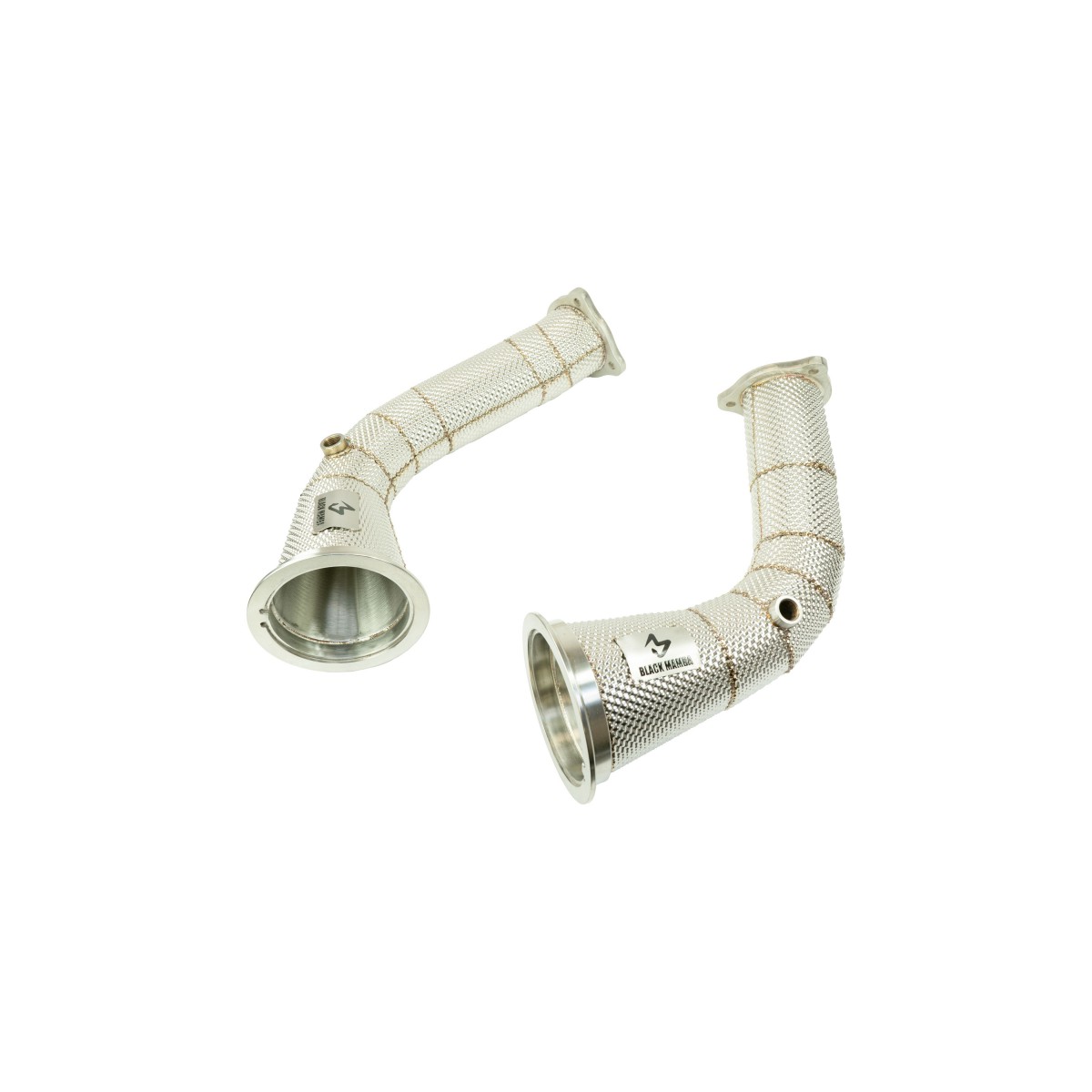 Black Mamba 4.5″ (114.3 mm) > 3″ (76 mm) Decat Downpipes for Audi RS4 B9 and RS5 F5 2.9 TFSI, expertly crafted from T304 stainless steel for maximum durability and performance. This 2-piece kit eliminates the factory catalysts, delivering a significant power gain of up to 34hp on Stage 1 setups, while the high-flow design ensures an aggressive exhaust note. Optional thermal insulation reduces heat radiation by 50%, making it an ideal upgrade for serious performance enthusiasts.