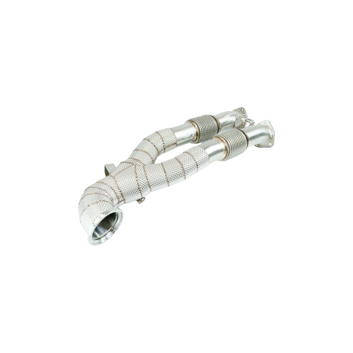Black Mamba 3.5″ (89 mm) to Dual 2.75″ (70 mm) Decat Downpipes for Audi TTRS 8S and RS3 8V Facelift 2.5 TFSI, crafted from T304 stainless steel for exceptional durability and performance. This direct bolt-on upgrade eliminates the main catalyst, delivering an aggressive exhaust tone and a power gain of 32hp on Stage 1 setups. Optional thermal insulation reduces heat radiation by up to 50%, enhancing engine bay temperature control.