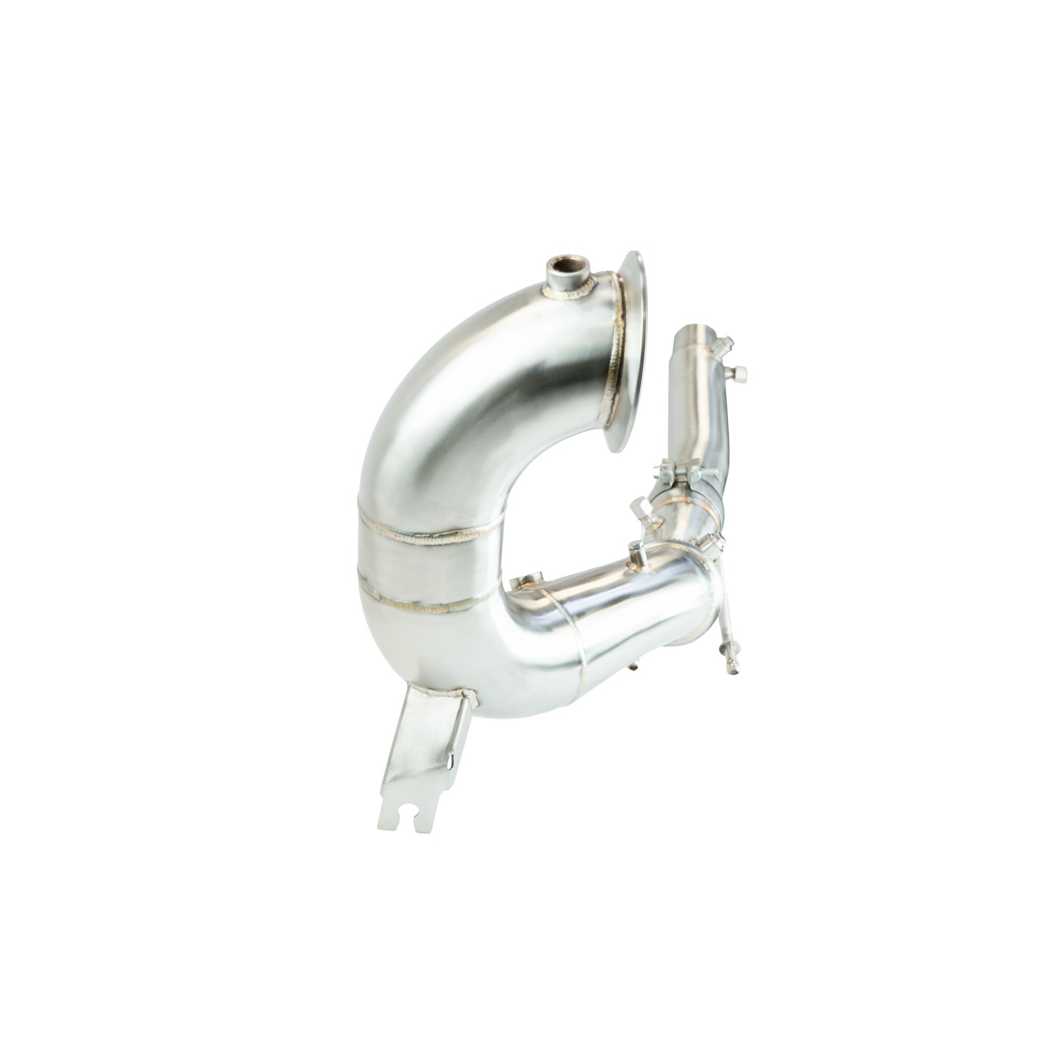 Black Mamba 3.5″ (90 mm) to 3″ (76 mm) Decat Downpipe for VW Golf 8 GTI and Skoda Octavia NX VRS 2WD 2.0 TFSI EA888.4 engines, engineered for optimal exhaust flow and power gains. Constructed from premium T304 stainless steel with handmade TIG welds, this direct bolt-on upgrade features a 3.5″ (90 mm) inlet for maximum turbine outlet flow, reducing to 3″ (76 mm) for optimal back pressure. Includes integrated reducer for seamless connection to the OEM catback and plugs for OPF pressure/temperature sensors.