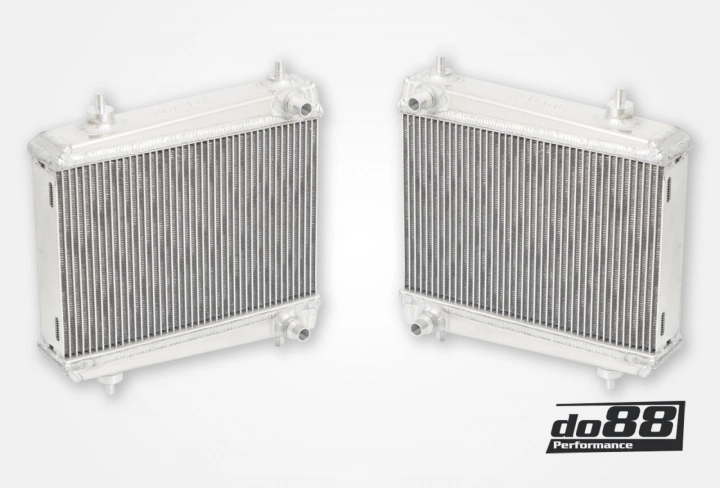 Fortunately, the design space available for the auxiliary radiators allows for both increased frontal surface area and core thickness on both sides of the car. The OE radiator is identical for both sides, and our do88 Performance Radiators are designed to be drop-in replacements for both left and right sides. We offer them as a pair because upgrading just one radiator isn’t as effective as upgrading both simultaneously. Our Performance Auxiliary Radiators provide enhanced cooling capacity to prevent heat soaking.