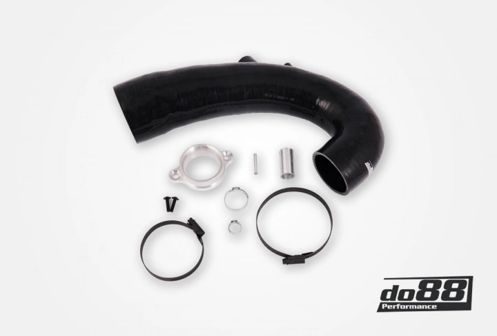 The kit comes with hose in black finish, CNC-machined adapter towards the turbo and top-quality, hose clamps.