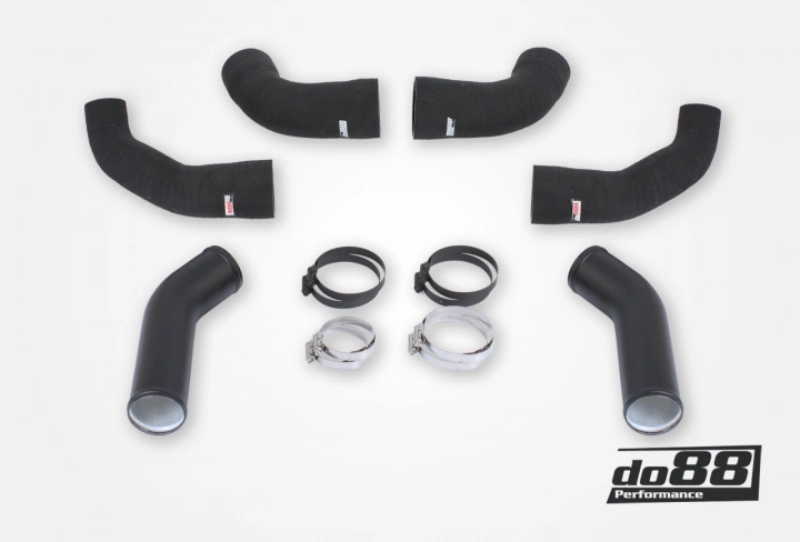 Crafted from mandrel bent 63 mm (2,5”) aluminum piping, this kit offers improved airflow and better perseverance over time. They are wrapped up in a matte black, structure powder coating. As a finishing touch they come with matte black silicone hoses, whereof the turbo outlet hoses are made from a high-temp spec. material that can handle 240°C continuous temperature. The hose clamps for this position are of the “constant tension” type, meaning they will compensate for temperature fluctuations in the material.