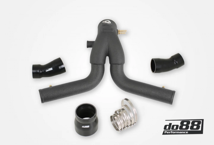The kit also includes 2 high quality custom designed silicone hoses which is available in two different versions. Which version you need depends on if you will install the y-pipe together with the OEM intercoolers or the do88 performance intercoolers. You can make your choice of hoses in the drop list above.