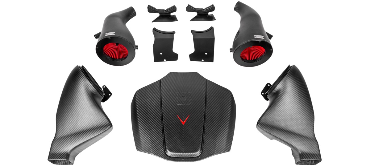 The Eventuri dynamic intake made of carbon fiber for the M178 engines of the Mercedes AMG GT / GTS / GTC / GTR consists of two large volume airboxes with washable and reusable synthetic filters, two intake ducts, a specific engine cover and everything needed for direct mounting. The efficiency and finish of this kit is as impresive as efficient thanks to a unique design that allows the system not only to increase the incoming air flow but also to keep the intake temperatures low enough to offer a great 18hp power gain on a standard engine.