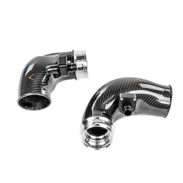 Fitting without modification to both OEM airboxes and performance intakes, these Eventuri turbo inlets connect the turbos to the intake pipes on the S63 engines of the BMW M5 F90 and BMW M8 F9x. Made from carbon fiber with a high gloss finish, these turbo inlets are designed to withstand extreme temperatures and pressures while optimising airflow and intake temperatures.