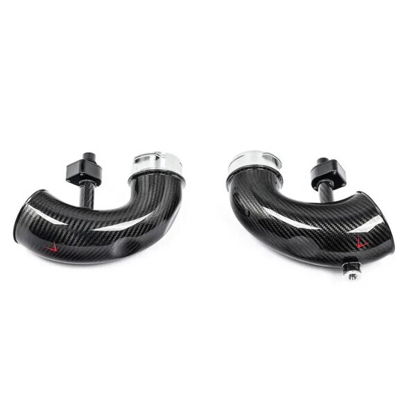 Presenting the perfect addition to our X5M, XM intake system to optimise the flow path all the way to the turbos. Our carbon inlets have a larger volume than the stock inlets by maintaining a larger diameter all the way to the turbos. The stock inlets narrow down immediately after the connection to the intake which creates a restriction especially at higher boost levels. We have alleviated this restriction and also designed the curvature to be as smooth as possible allowing the turbos to function with reduced resistance. Made from prepreg carbon fiber with CNC machined flanges, the inlets also provide an aesthetic improvement to the engine bay.
